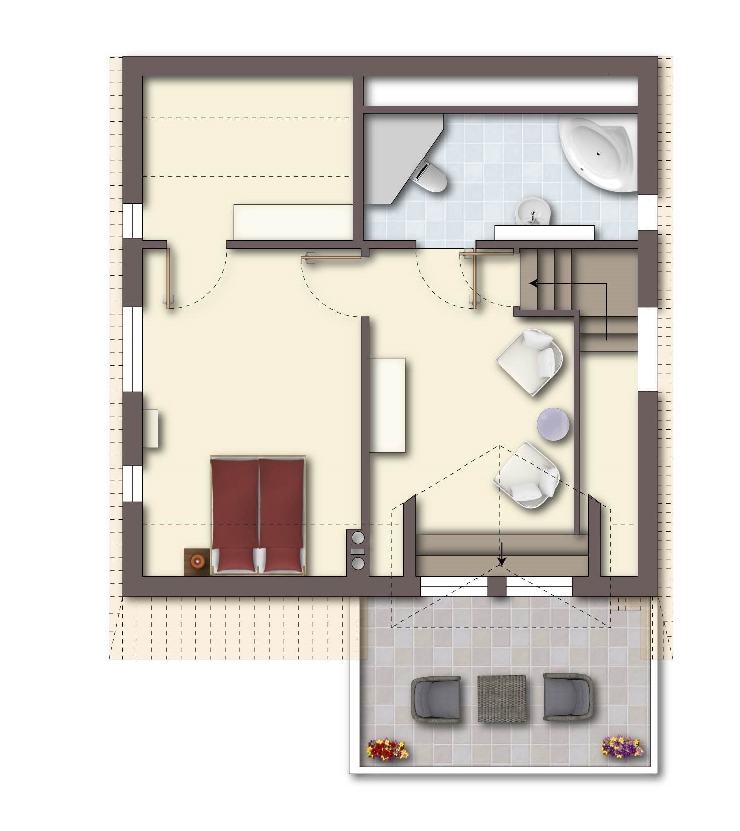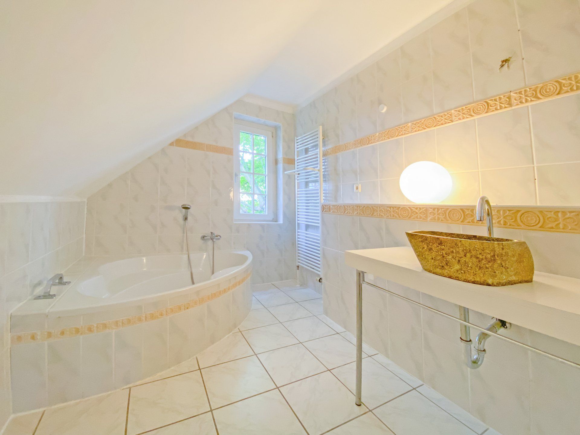 Im Obergeschoss befinden sich ein helles Schlafzimmer mit Ankleidezimmer sowie ein Durchgangszimmer mit Zugang zu der Dachterrasse, welches ideal als Büro oder Schlafzimmer genutzt werden kann und ein Tageslichtbad mit Badewanne.