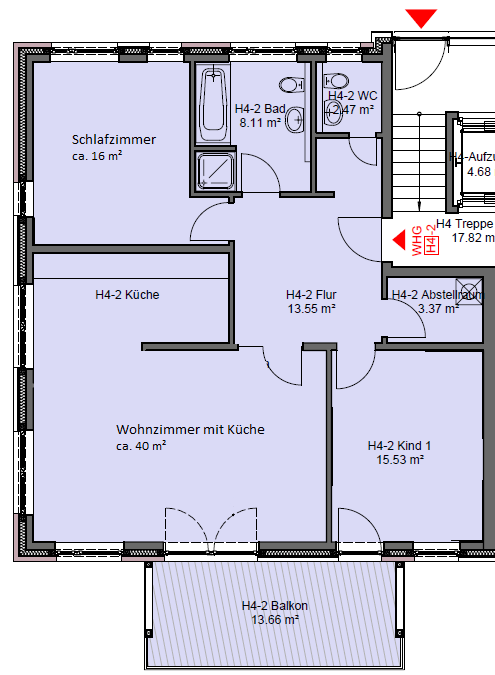 Objektart: 2-Zimmer-Wohnung im 4 OG, Schlafzimmer: 1, Badezimmer: 1, Wohnzimmer:1