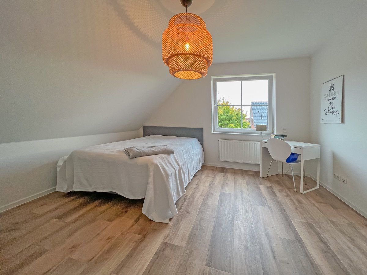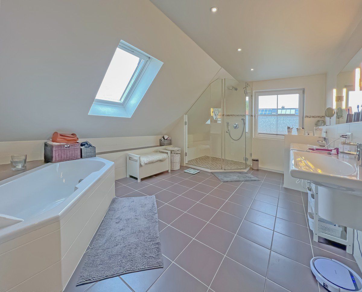 Im Obergeschoss des Hauses erreichen sie ein großes, hochwertig eingerichtetes Tageslichtbad mit Badewanne, Dusche, doppeltem Waschbecken, WC und Fußbodenheizung. Viel Platz wird Ihnen hier durch die drei großen Schlafzimmer zu Teil, die mit großen Fenstern und hellen Böden sehr einladend wirken und jedem Einrichtungsstil gerecht werden.